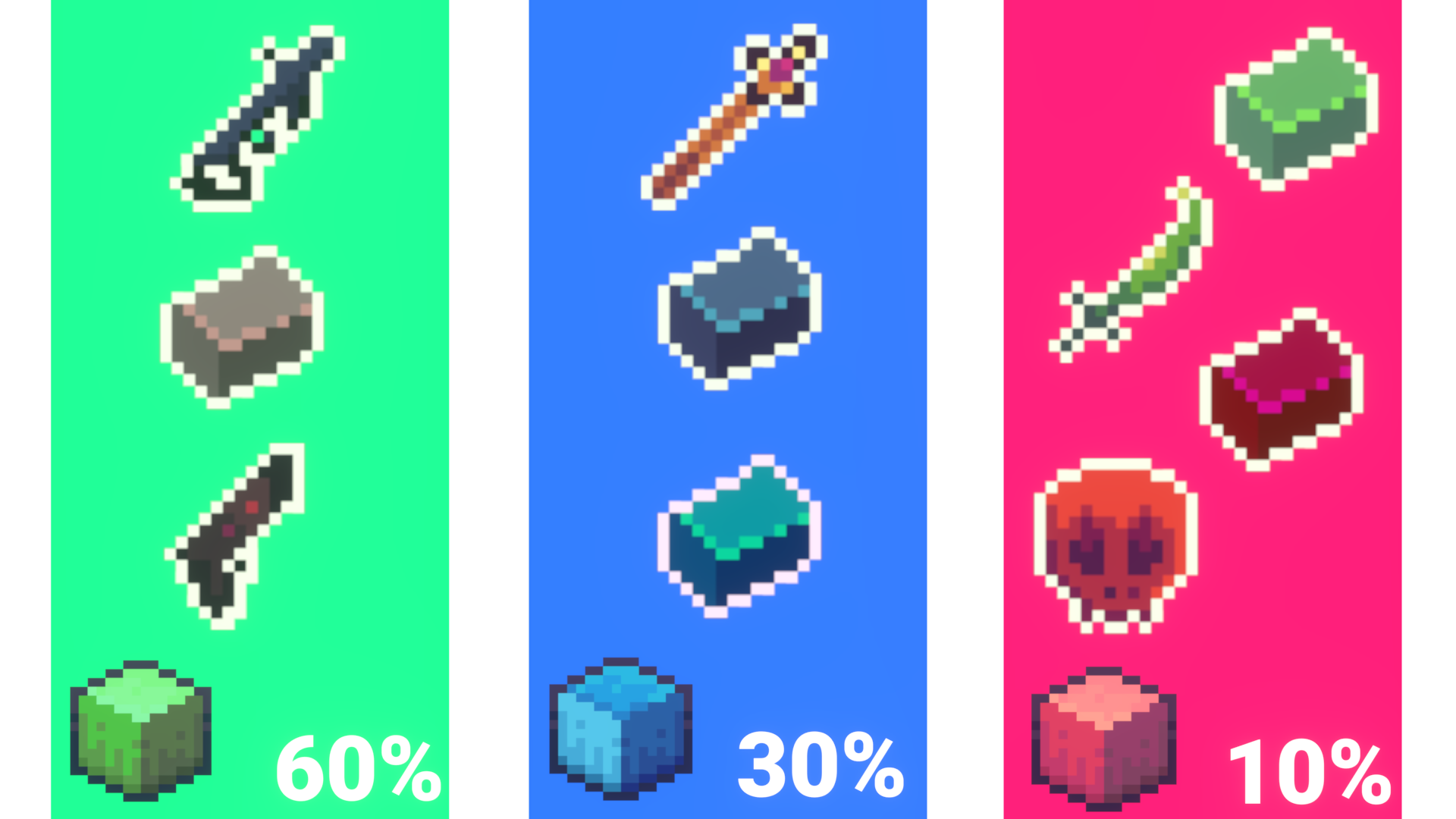 The design of a loot distribution system is really quite simple, and suggests an near-ubiquitous use of weighted probabilities in game design. Extensions to this system exist, like the creation of dependent probabilities, where, if the player can attain multiple loot items, the probability of getting each one isn't random, but biased depending on the other items. For example, an enterprising microtransaction engineer might reduce the probability of getting a further rare and valuable player skin in consecutive rolls after one is already obtained. While being ethically questionable, it suggests there is utility to dependent probability systems, not only the independent system I have described in this post.
