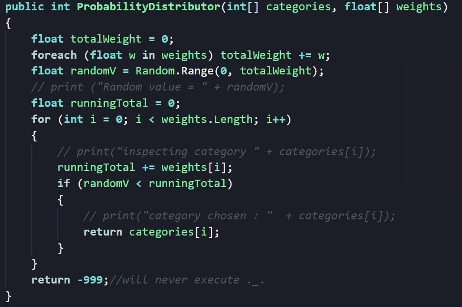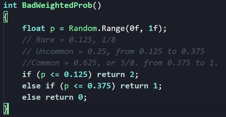 Though this seems a simple system to implement, it's not really obvious how to create a weighted probability. Most programming languages support some ability to access random numbers, but it's unusual to see one that supports weighted selection. My code is presented in C#, as I wrote this for my Unity-based game, but its meaning should be clear enough as I don't use any C# specific syntax/notation. One thing to note, however, is that Unity's Random.Range(x,y) function returns a number in the range [x,y).